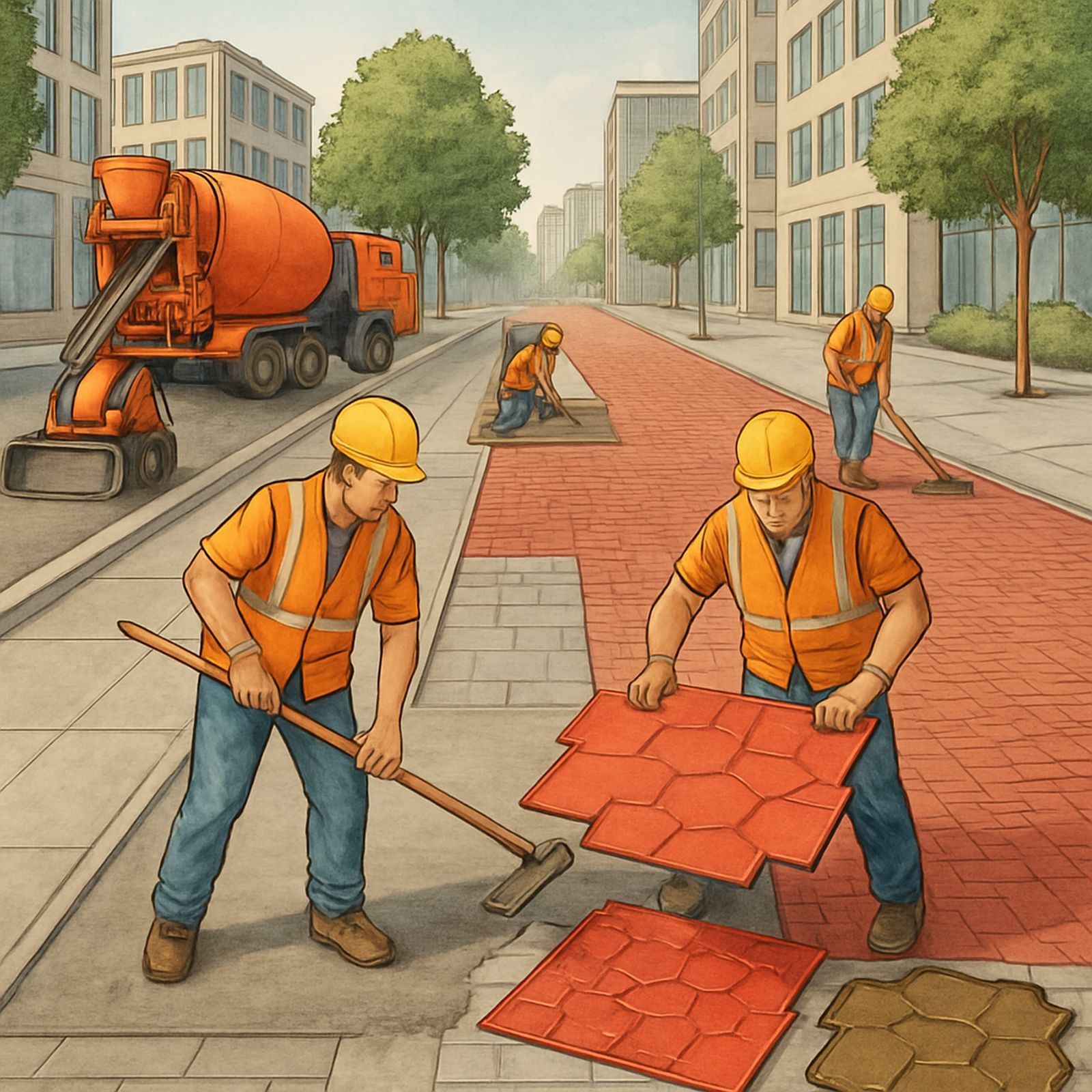 Tutto inizia con la corretta preparazione del terreno. La zona da pavimentare deve essere livellata, compattata e dotata di un adeguato sistema di drenaggio per evitare ristagni d’acqua. In genere si stende uno strato di ghiaia e sabbia, spesso compattato con una piastra vibrante. È importante che la base sia ben livellata, poiché eventuali dislivelli si rifletteranno sulla superficie finale del cemento stampato.