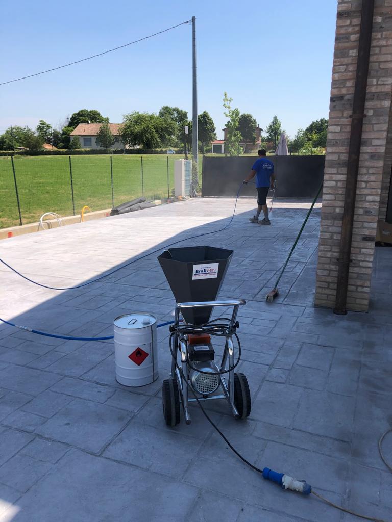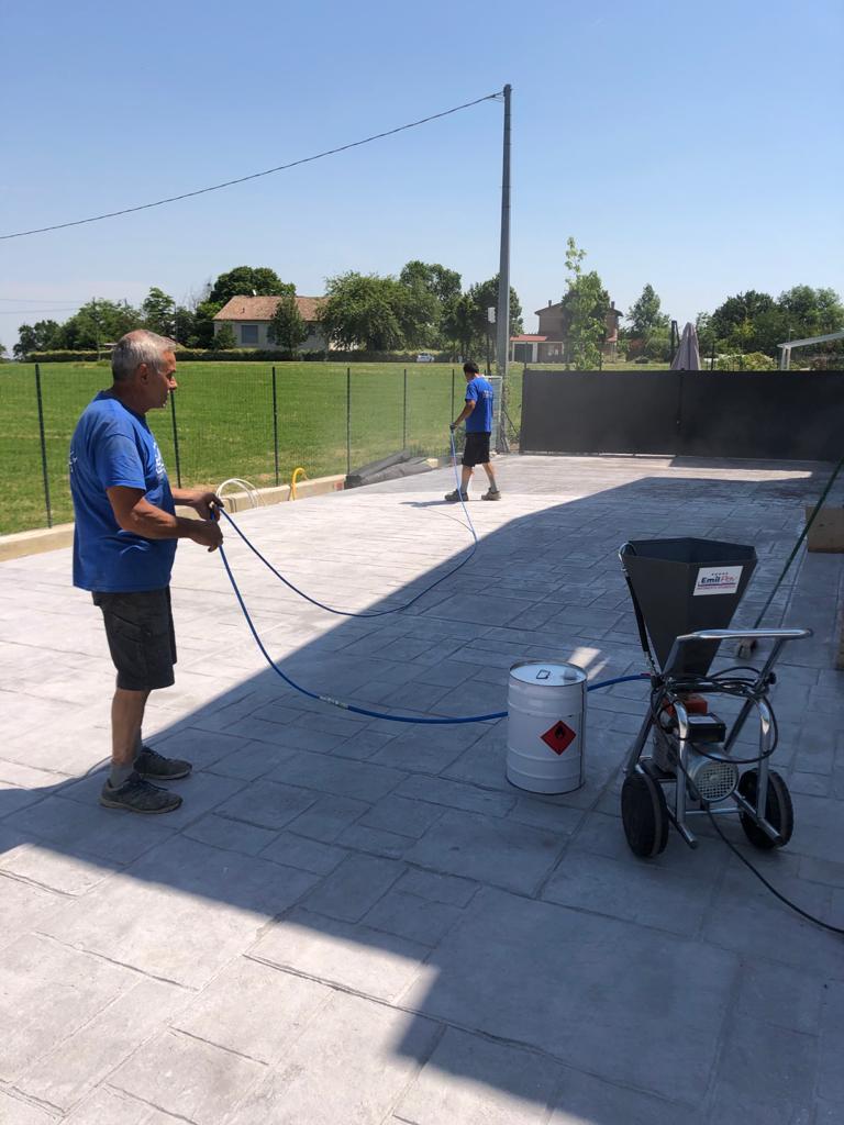 Il progetto ha previsto un’attenta preparazione del sottofondo, processo determinante per garantire stabilità e durata nel tempo. Dopo la corretta formazione degli strati di base, abbiamo eseguito il getto del calcestruzzo e la successiva lavorazione superficiale con stampa decorativa. La texture scelta ha dato vita a un vero e proprio pavimento architettonico, capace di coniugare resa estetica e prestazioni tecniche.