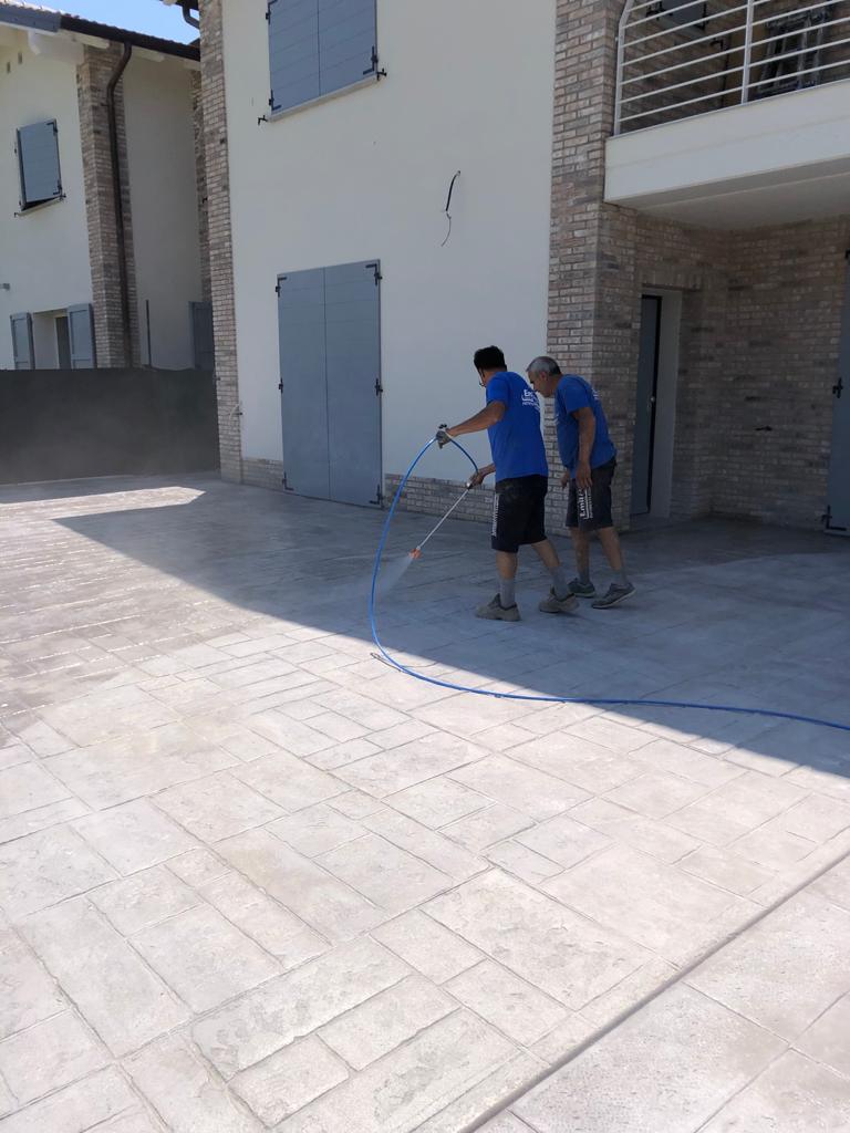 Completata la fase di stampaggio, abbiamo effettuato il lavaggio finale e applicato una resina protettiva trasparente. Questo trattamento consente di aumentare la resistenza all’usura, migliorare l’impermeabilità e facilitare la manutenzione ordinaria. Il risultato è una pavimentazione in calcestruzzo stampato antisdrucciolo, durevole e adatta al traffico veicolare tipico degli spazi condominiali. È la soluzione ideale per cortili, ingressi e percorsi comuni di edifici residenziali in provincia di Reggio Emilia.