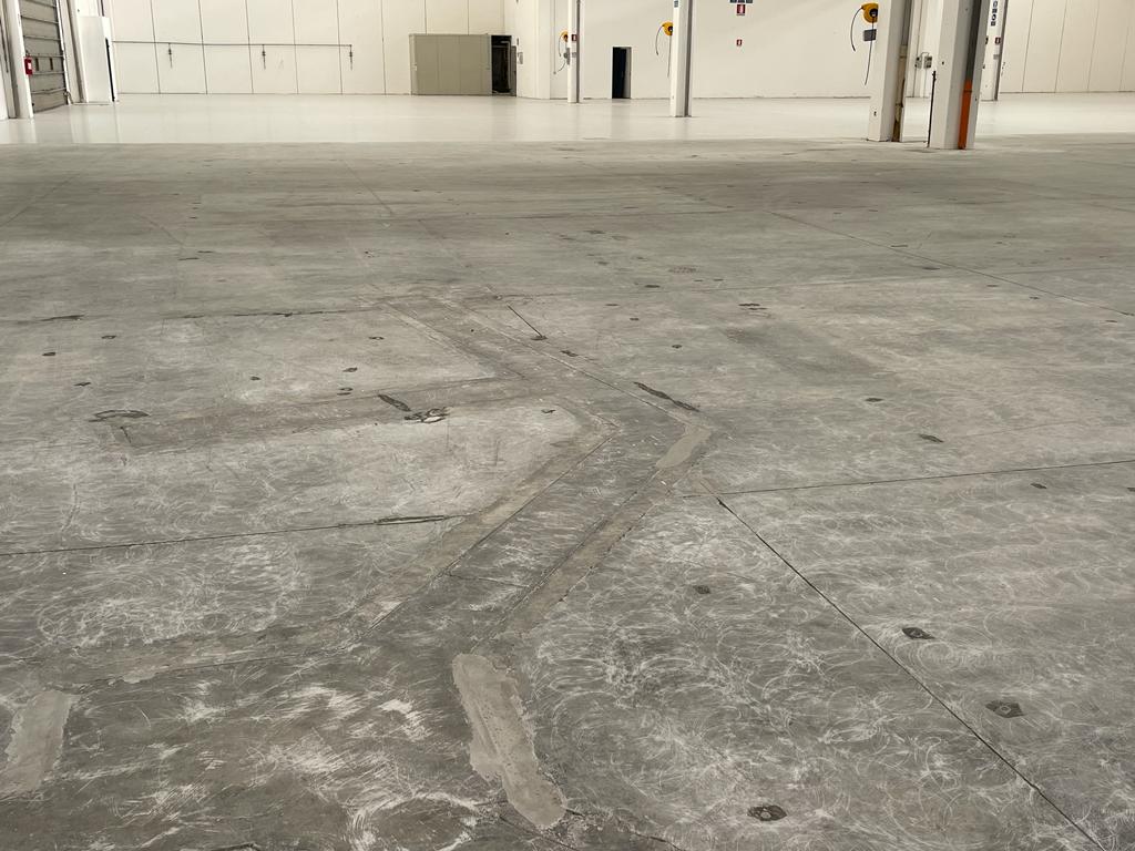 Prima di definire il ciclo di intervento, abbiamo eseguito un’analisi tecnica dello stato del supporto, valutando il livello di degrado, la planarità e la presenza di zone ammalorate. La prima fase operativa ha previsto una levigatura meccanica del pavimento industriale, indispensabile per rimuovere lo strato deteriorato, eliminare le parti incoerenti e preparare correttamente la base per le lavorazioni successive. Le aree più compromesse sono state ripristinate con interventi di regolarizzazione mirati, così da garantire continuità e uniformità alla superficie.