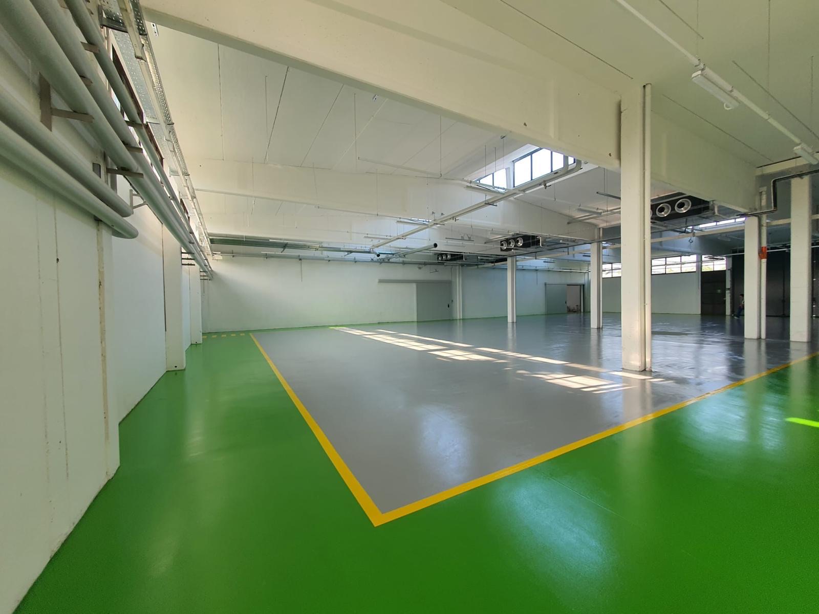 Successivamente abbiamo applicato un ciclo continuo in resina epossidica, studiato per ambienti industriali e commerciali. La finitura scelta è stata un grigio chiaro, integrato con fasce verdi e segnaletica gialla per delimitare corsie di transito, aree operative e posti auto. Questa soluzione non solo migliora l’estetica dello spazio, ma contribuisce in modo concreto alla sicurezza e all’organizzazione interna.