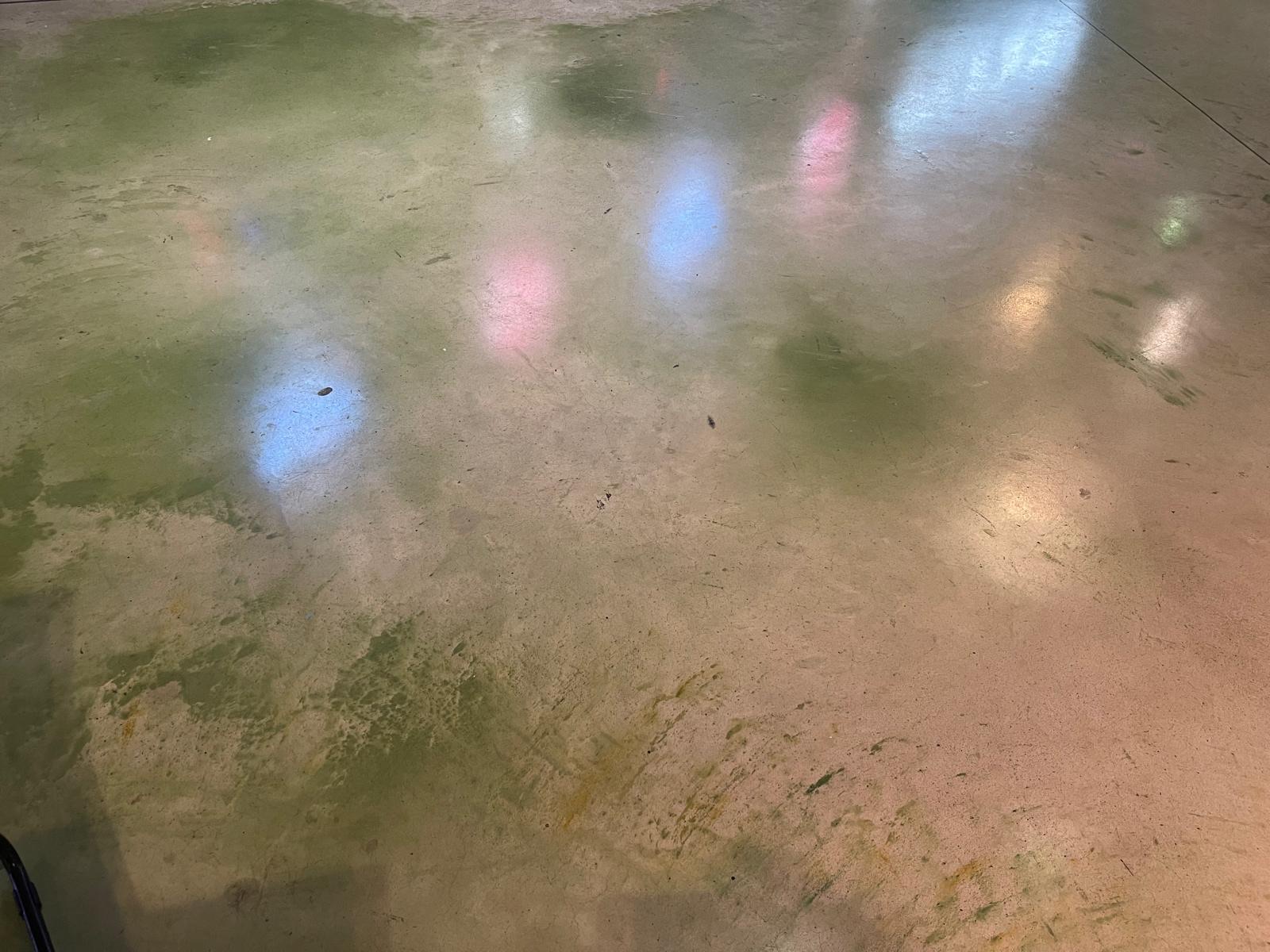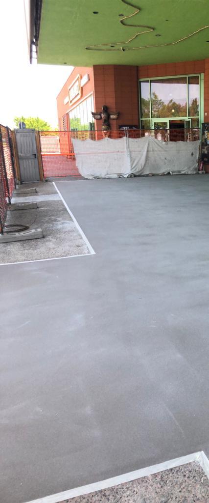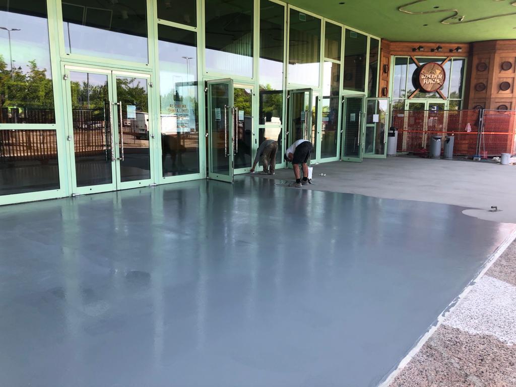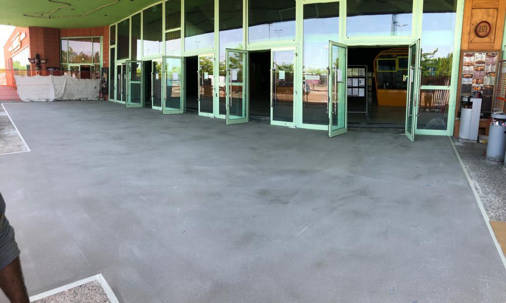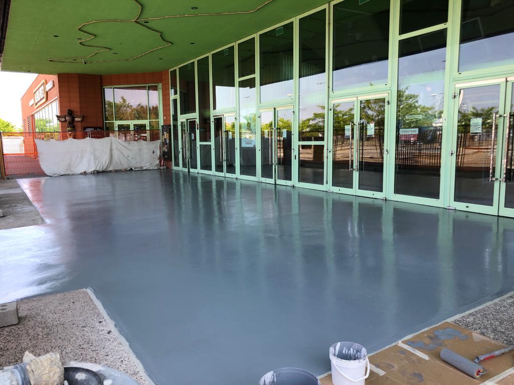 Il progetto è proseguito anche all’esterno del complesso, nell’area di accesso al cinema, dove sono stati realizzati 250 m² di pavimentazione in calcestruzzo acidificato verde. Questa scelta ha creato coerenza estetica tra interno ed esterno, garantendo una superficie adatta al passaggio intenso di persone e carrelli tipico delle aree commerciali.